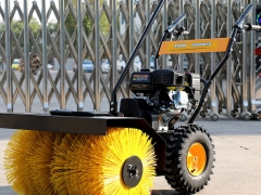 手推式扫雪机由中型卡车或重型卡车、四缸汽车发动机、吸 雪管、鼓风机、排雪管、吸雪口、吸雪口液压升降装置、 旋转式清扫刷、清扫刷连杆、固定架、 清扫刷液压升降装置组成。